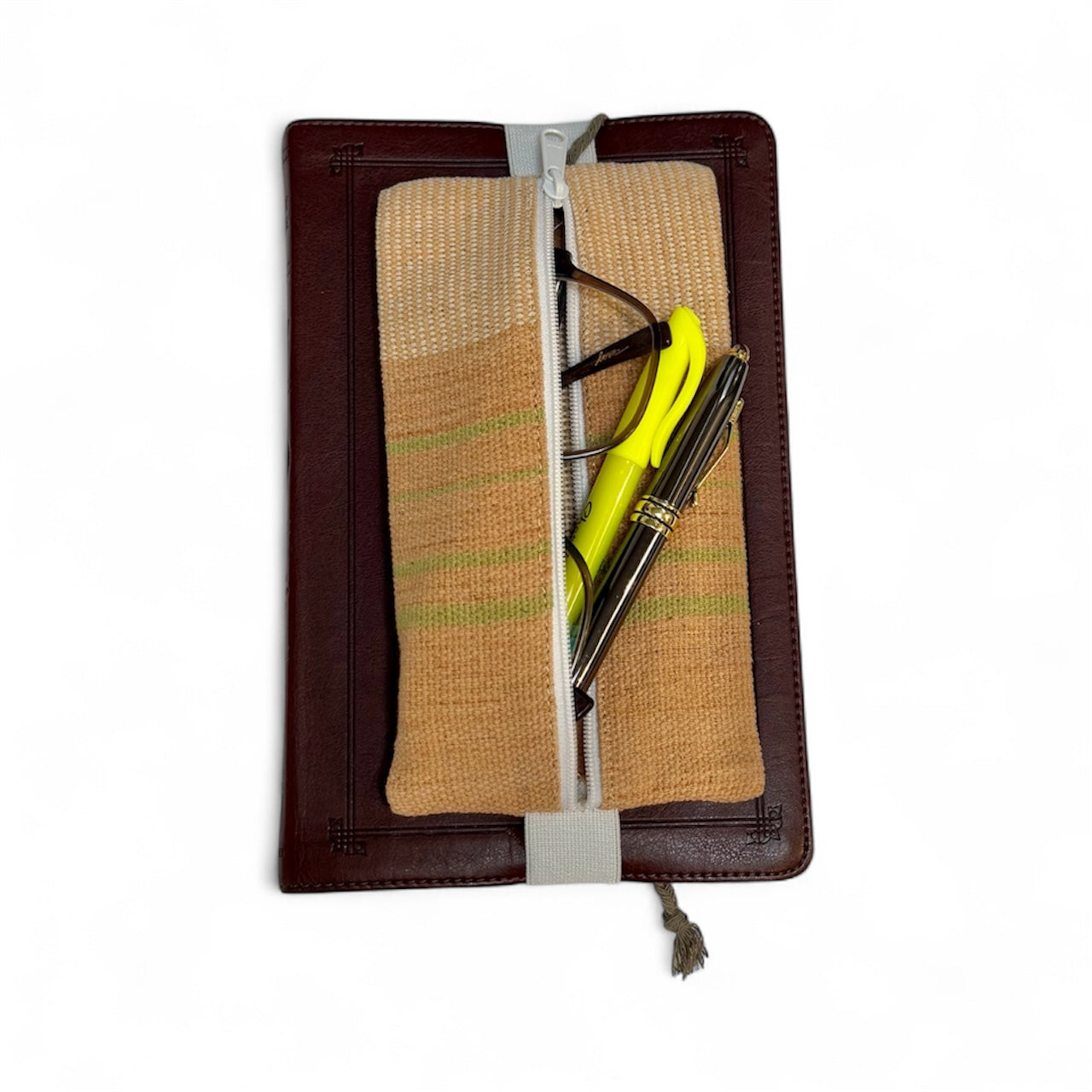 Hand-crafted with natural dyed, hand-loomed fabric, this zippered pouch holds all your essential writing tools or reading glasses and slips over your journal or book cover with an elastic band. It is adorned with an attached bookmark to keep your place. Practical, stylish and perfect for writing or study. Made with love and hope in the artisan village of Ba Kaeo.