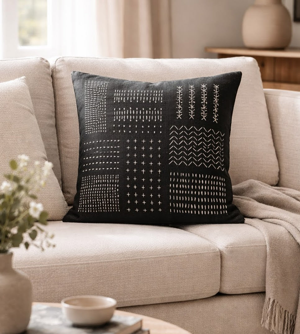 Monochrome meets tradition. Every hand stitch tells a story of resilience and craftsmanship in the village of Huay Mei. Inspired by "sashiko" hand-stitching, this collection of minimalistic interchangeable designs offer a style of simplicity in natural hand-woven fabric with hand-stitching. 18"x18' in size.